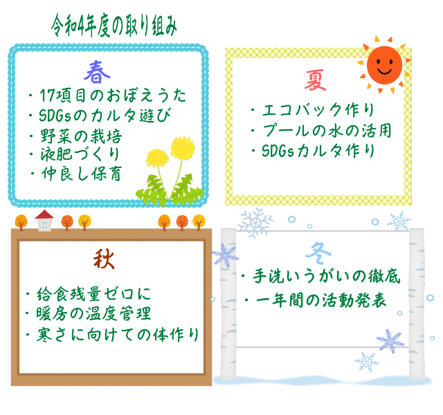 no onebehind)」という誓いのもと、人間、地球及び繁栄のための行動計画として、「貧困」「健康と福祉」「教育」「働きがい」「気候変動」など17の目標と169のターゲットで構成されています。学校法人昭和学園、宮崎ひがし幼稚園は、学園内幼稚園と共に、SDGsのゴール達成を目指します。①子どもが楽しんで取り組めるSDGs保育の主役は子供たちです。②保育士と保護者の連携保育士と保護者が連携して学んだことを正しく実践できる環境をつくり。③ステップごとの理解で誰一人取り残さない子供たちは一人ひとり理解のスピードや性格・積極性などに個性があります。誰一人取り残さずにSDGs保育を行うためには「きっかけ」⇒「疑問」⇒「理解」⇒「気づき」といったように段階的に理解しやすく実践していきたいと思います。