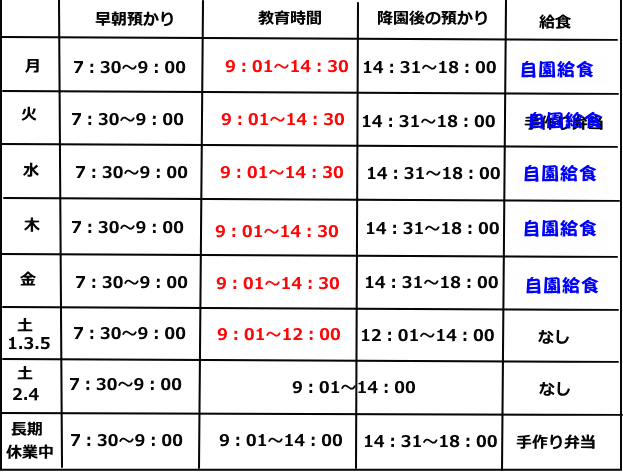 ★預かり保育 7:30~9:00 14:30~18:00の時間帯の間、全ての園児が利用できます。 ★土曜日は、休日預かりとして保育をいたします。希望者は申し込み下さい。
